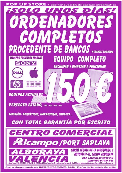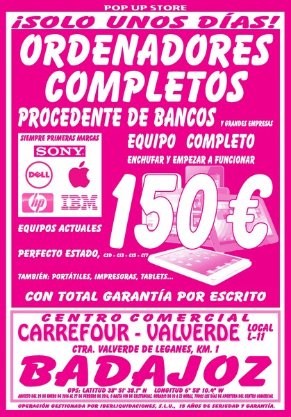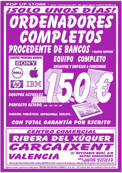 ORDENADORES PROCEDENTES DE BANCOS A 150€. EQUIPOS ACTUALES. PRECIO FINAL. PRIMERAS MARCAS: HP- DELL- IBM-SONY. TAMBIÉN TABLETS: APPLE- FUJITSU- SUNSTECH.