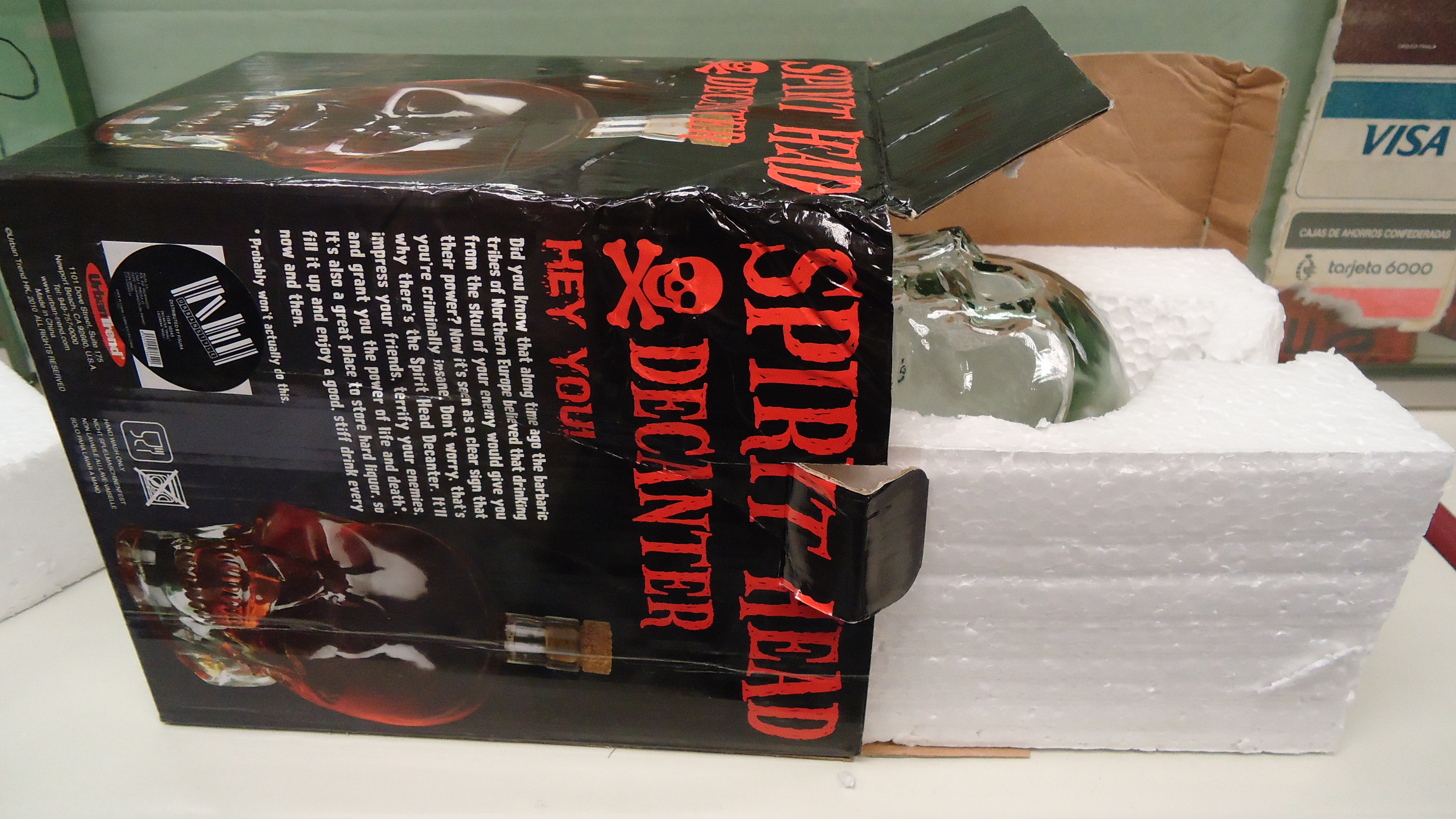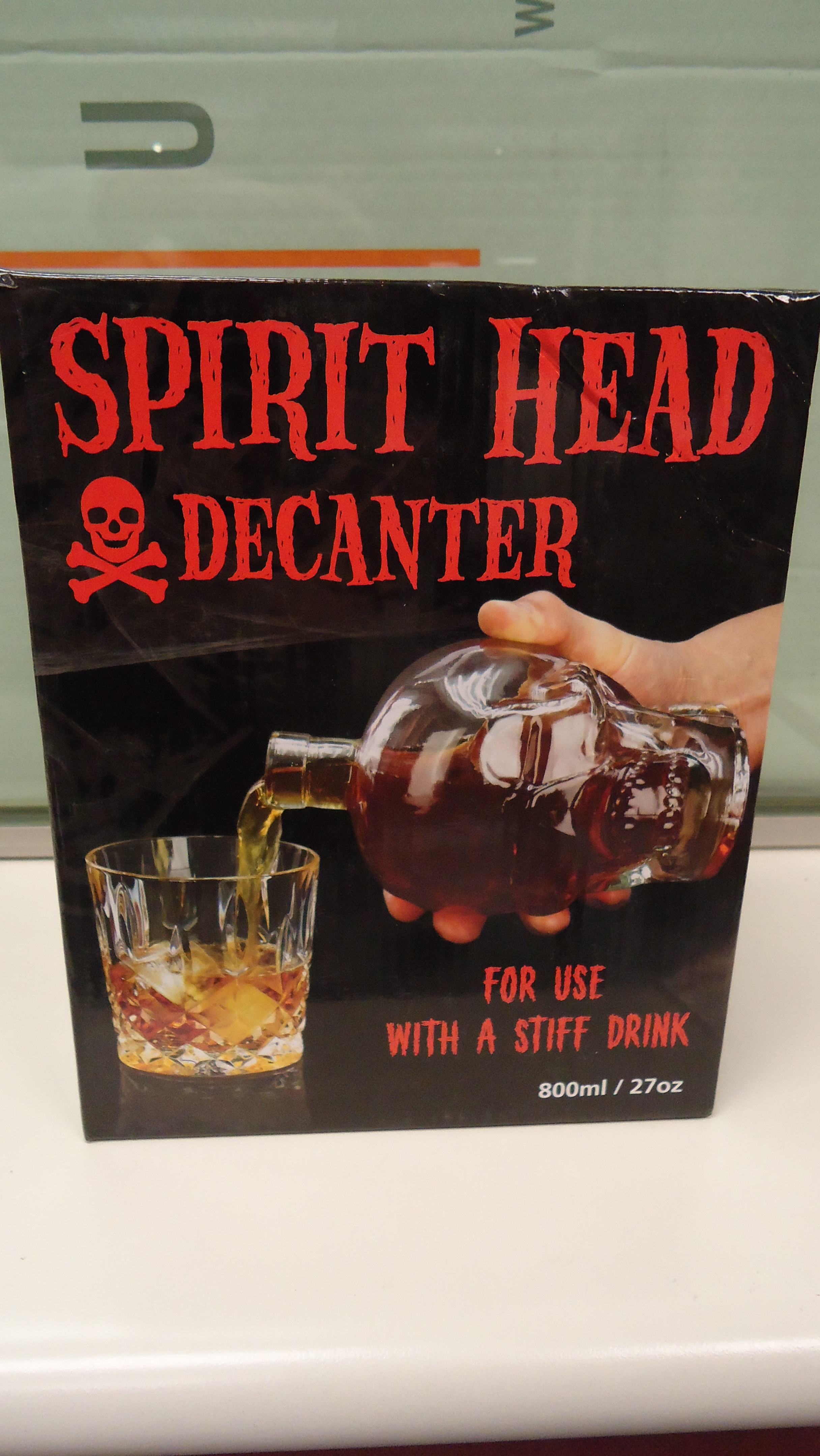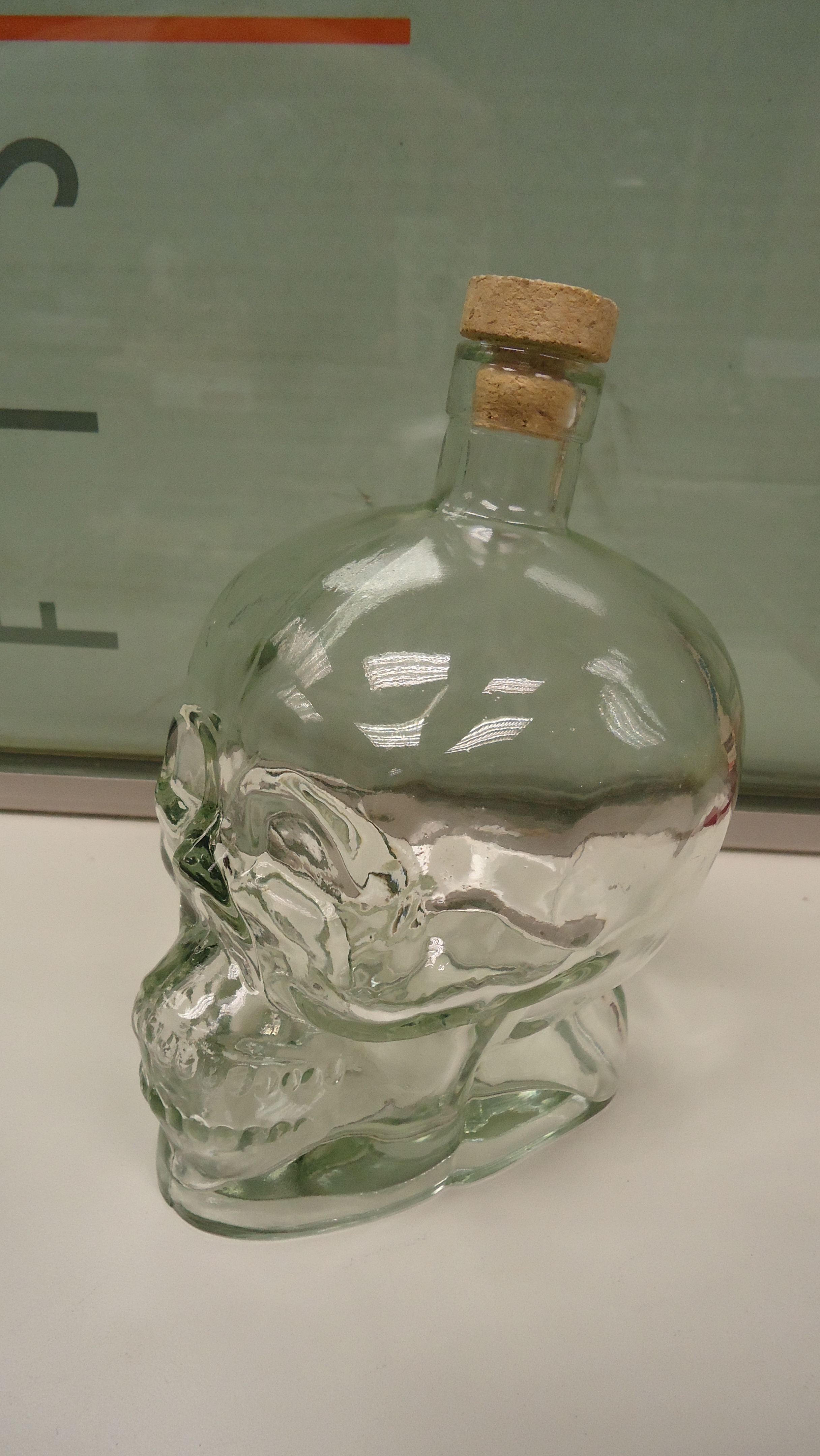 Botella de cristal con forma de calavera y tapón de corcho. Medidas 19.5cm Al x 11cm La x 11cm An. Embalaje original. Disponemos de cantidad. PARA COMPRA DE CANTIDAD CONSULTAR PRECIO.