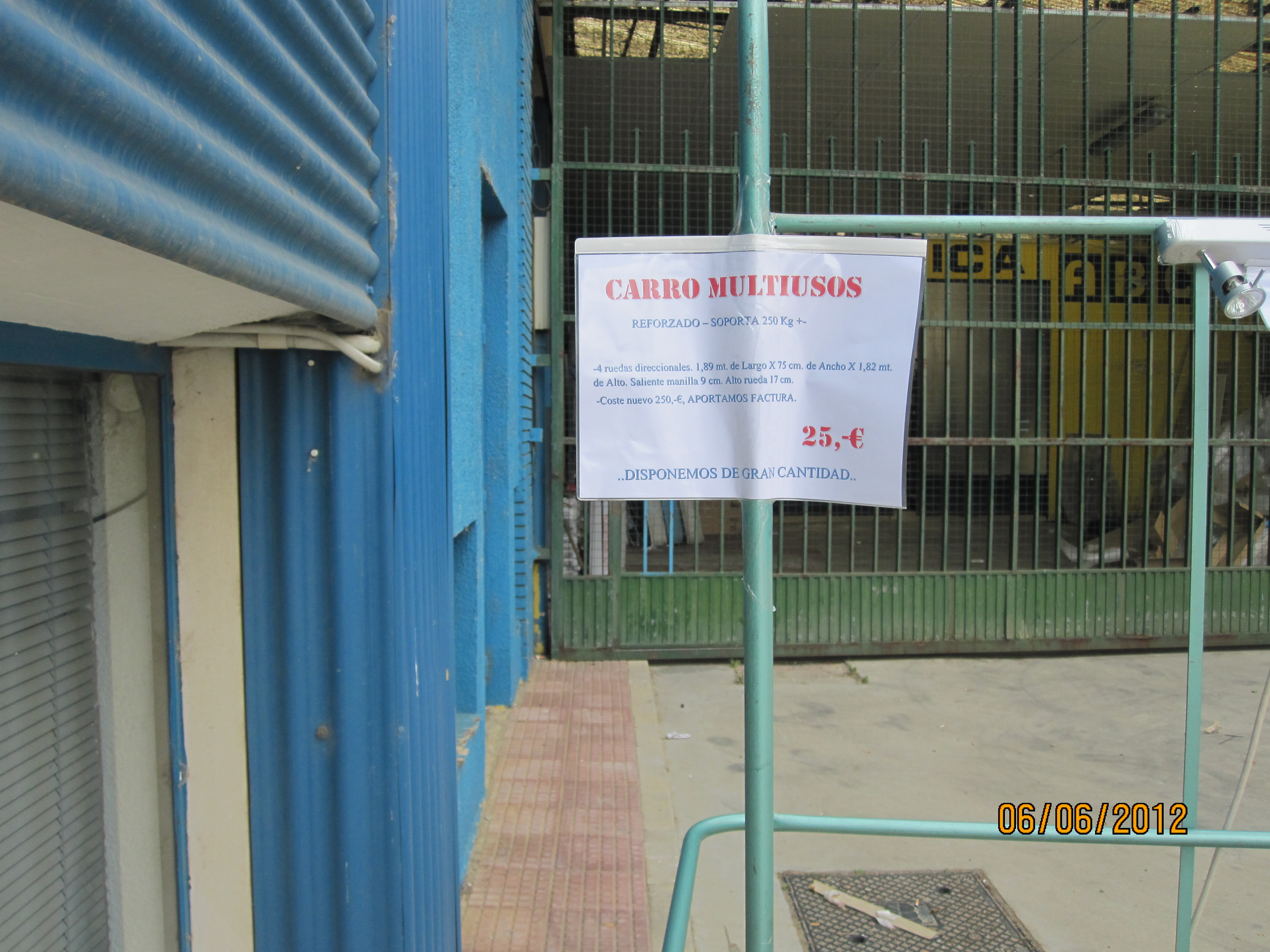 CARRO MULTIUSOS REFORZADO, SOPORTA 25Kg+-, 4 ruedas direccionales 1.89m de largo x 75cm ancho x 1.82m alto, saliente manilla 9cm. Alto de rueda 17cm.