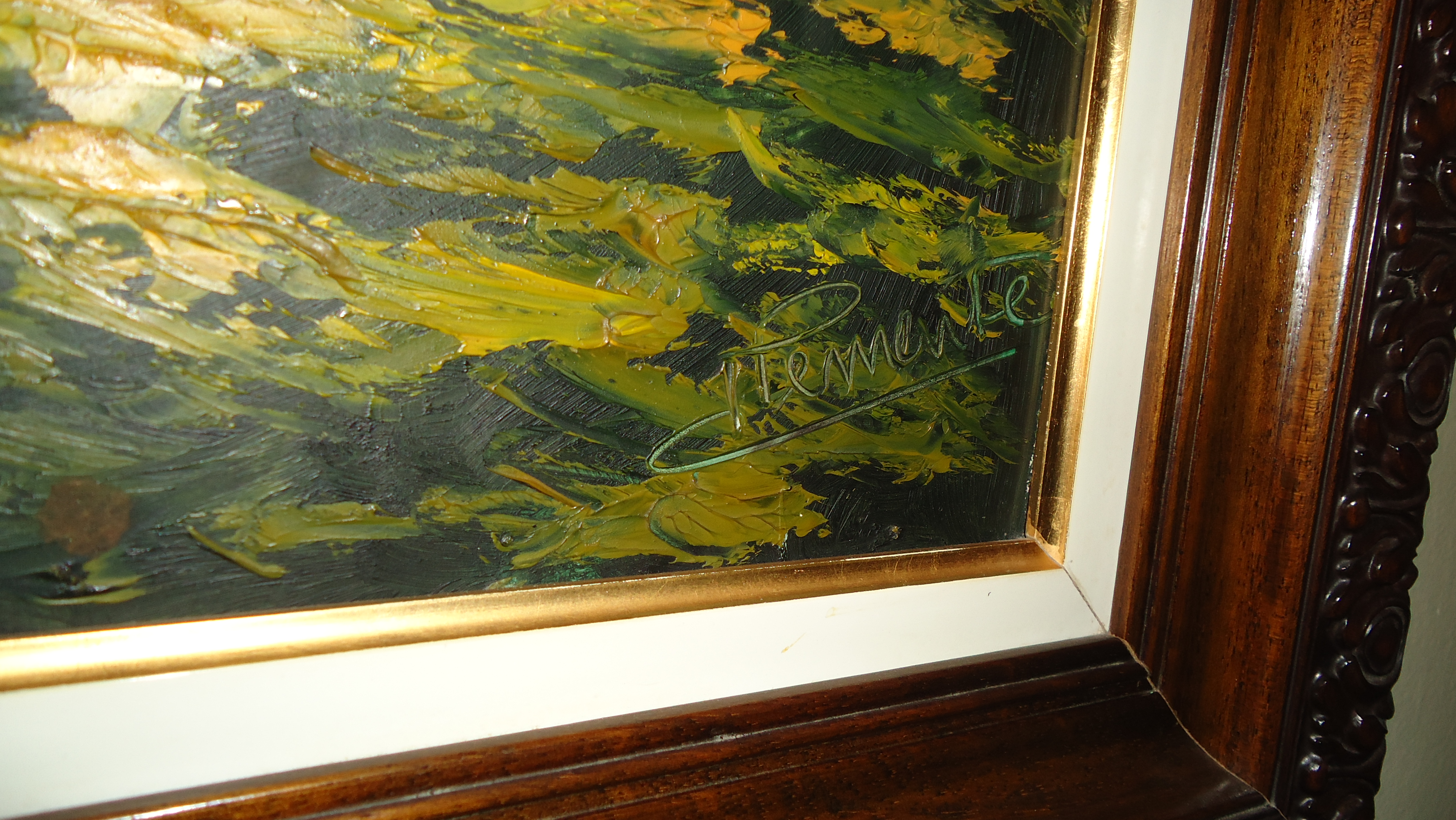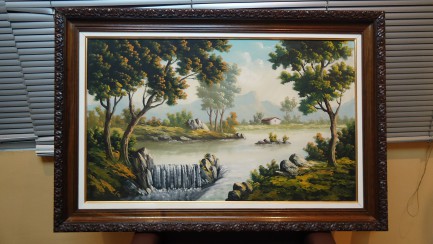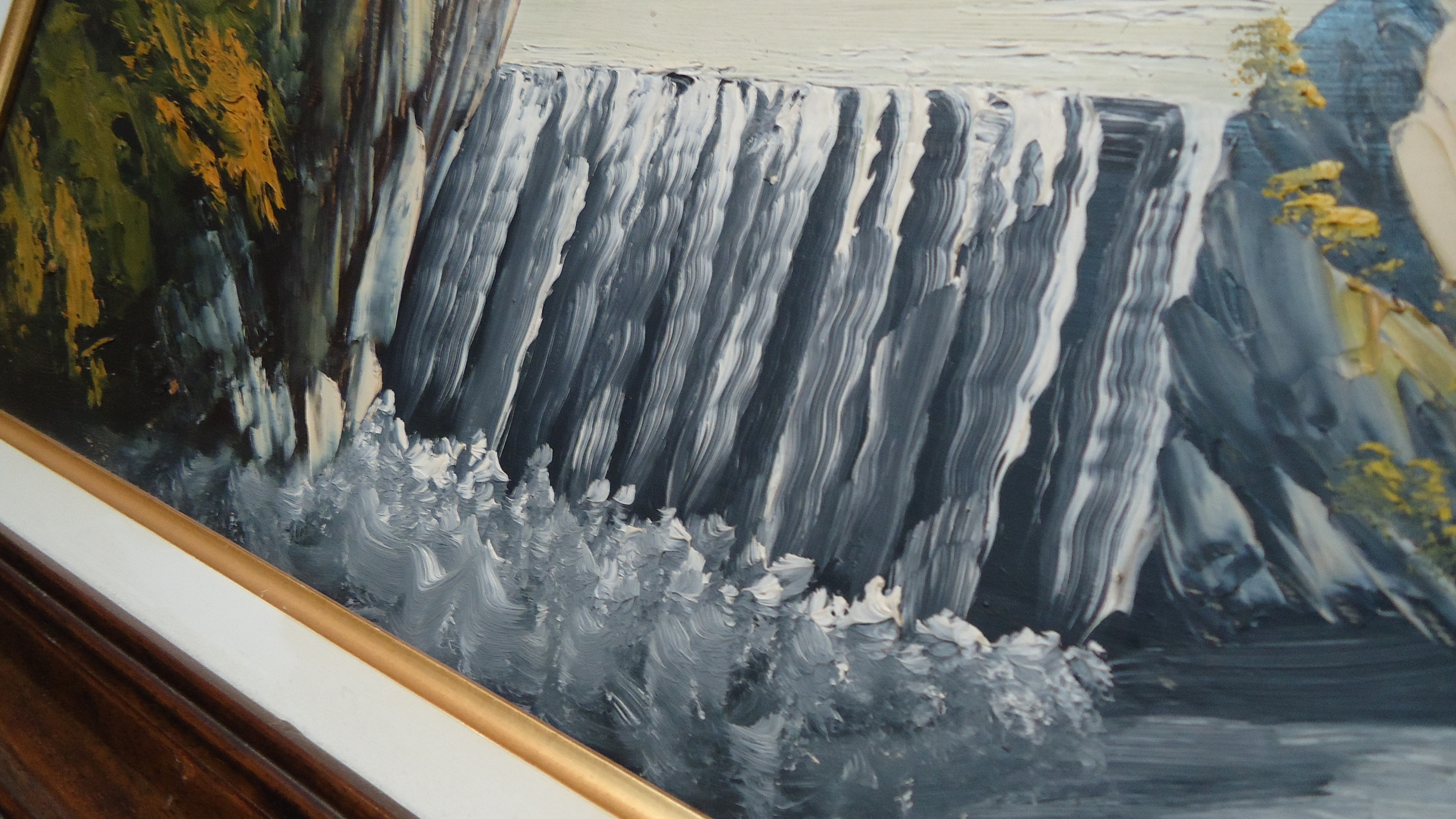 LIENZO AL ÓLEO, PAISAJE CON CASCADA. LIENZO 89 LARGO X 54 ALTO. CON MARCO DE MADERA LABRADA 107 LARGO X 72 ALTO X 4 ANCHO.