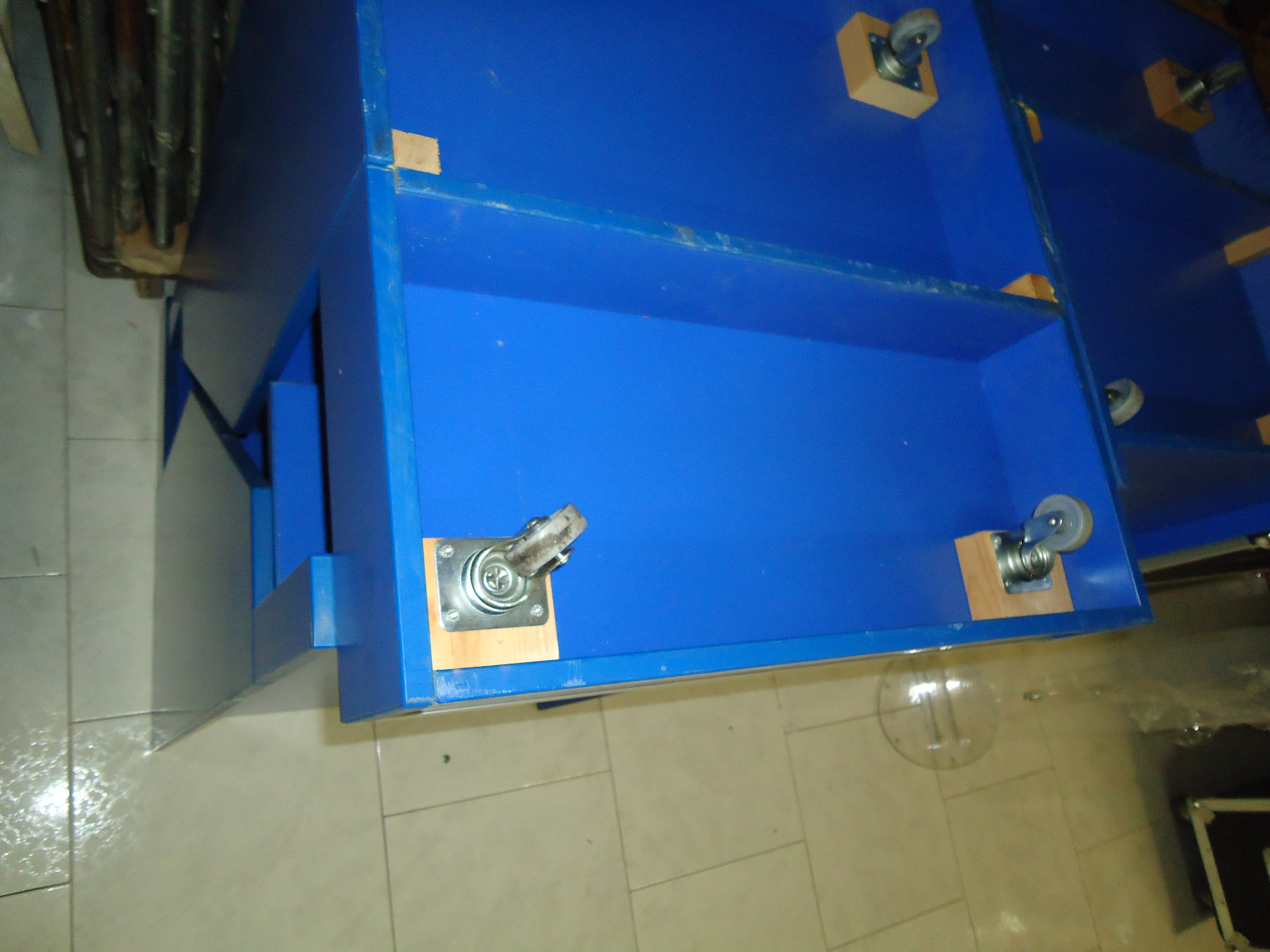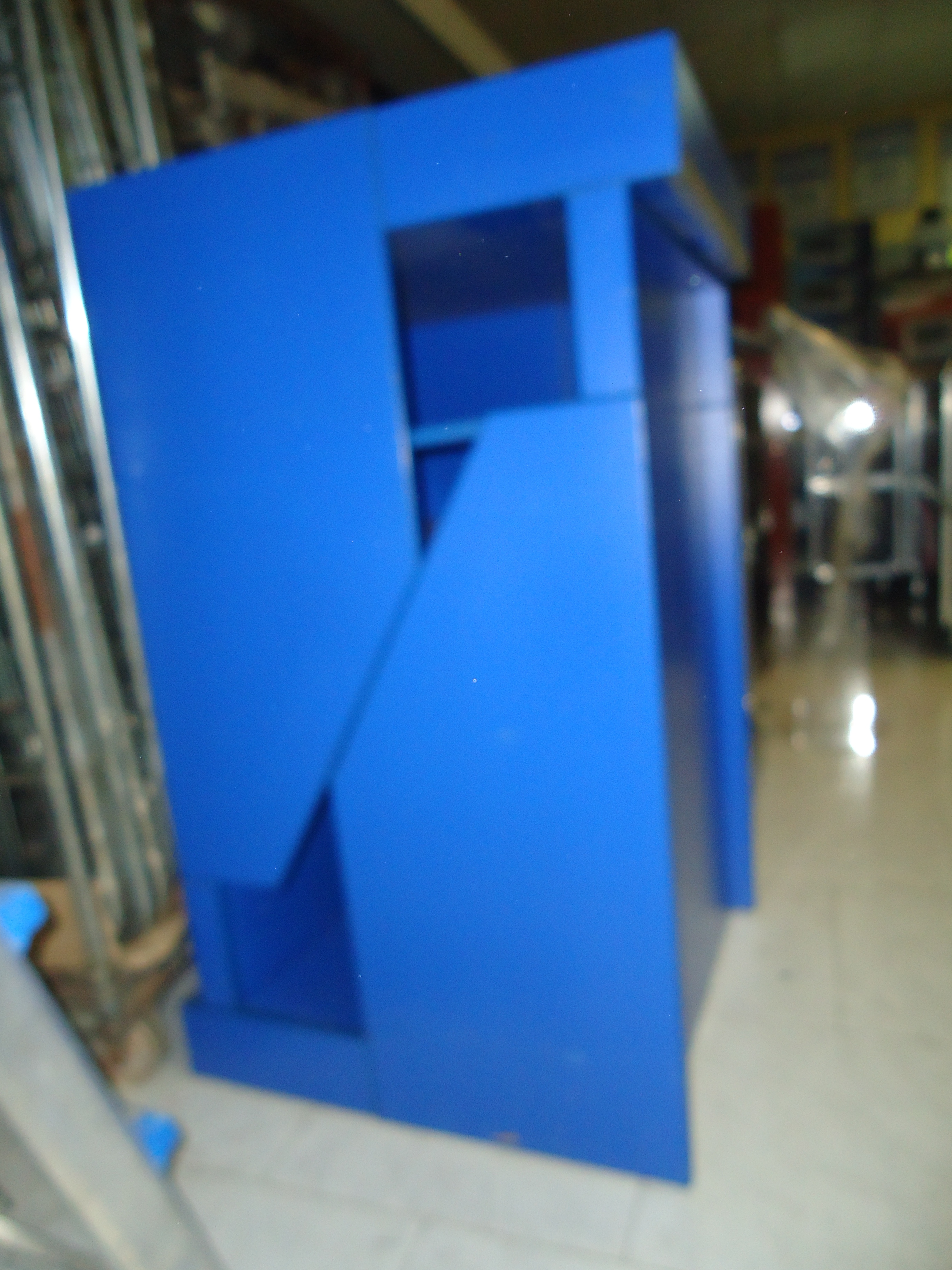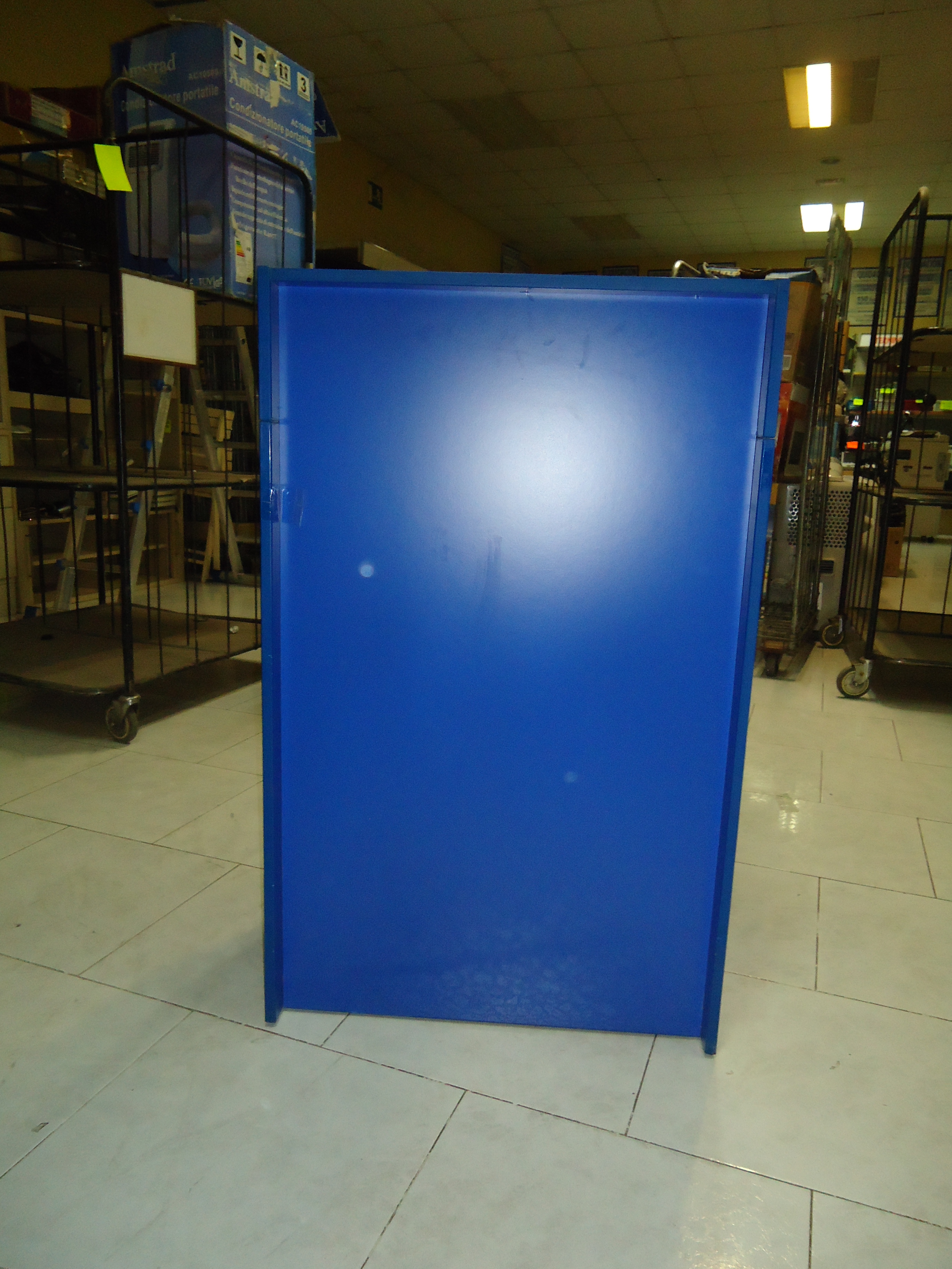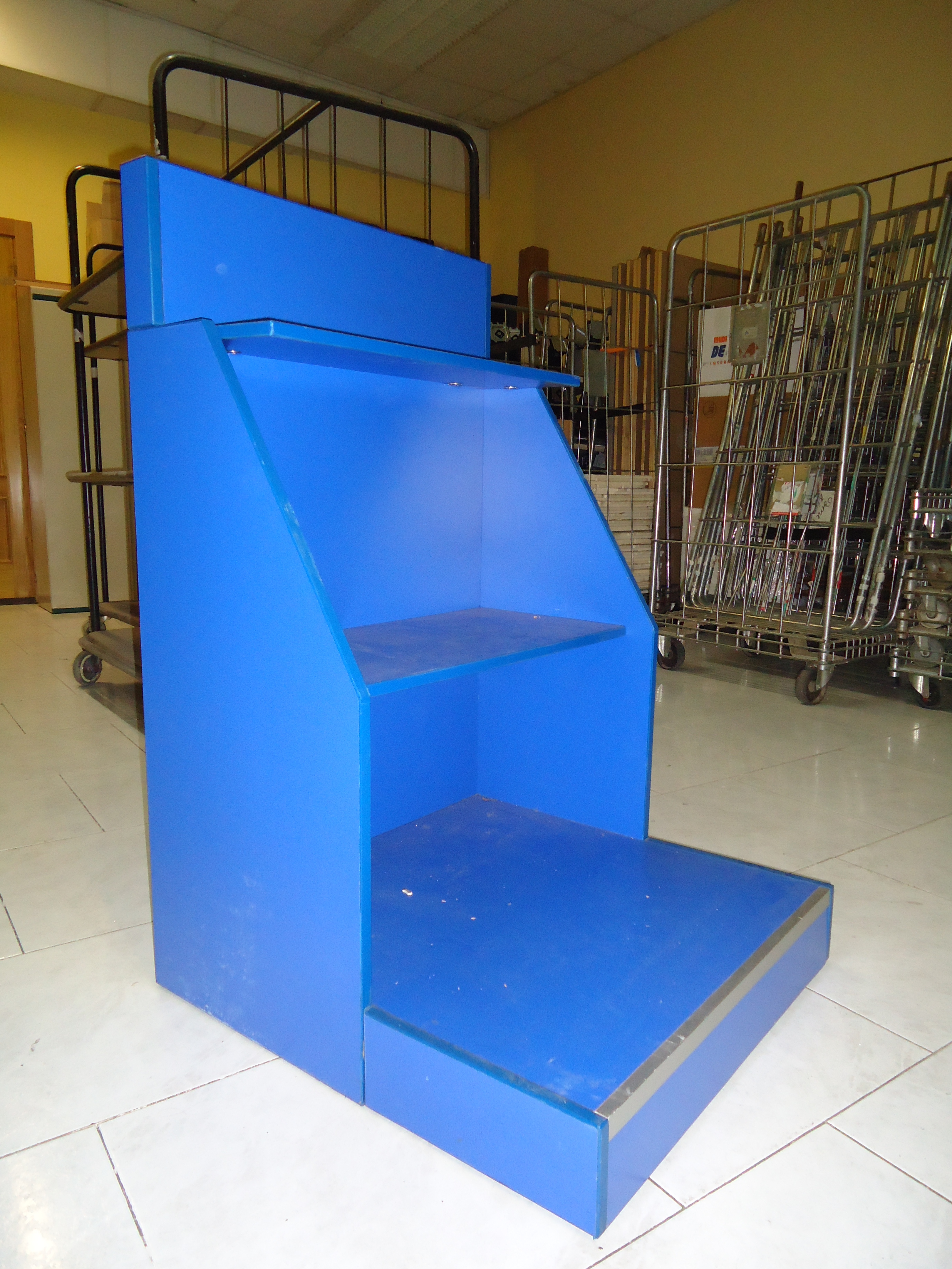 MODULO EXPOSITOR, madera/ con ruedas / embellecedor metálico en balda inferior, ruedas giratorias y orientables. Medidas aproximadas 70 cm. Largo x 100 largo x 100 alto.