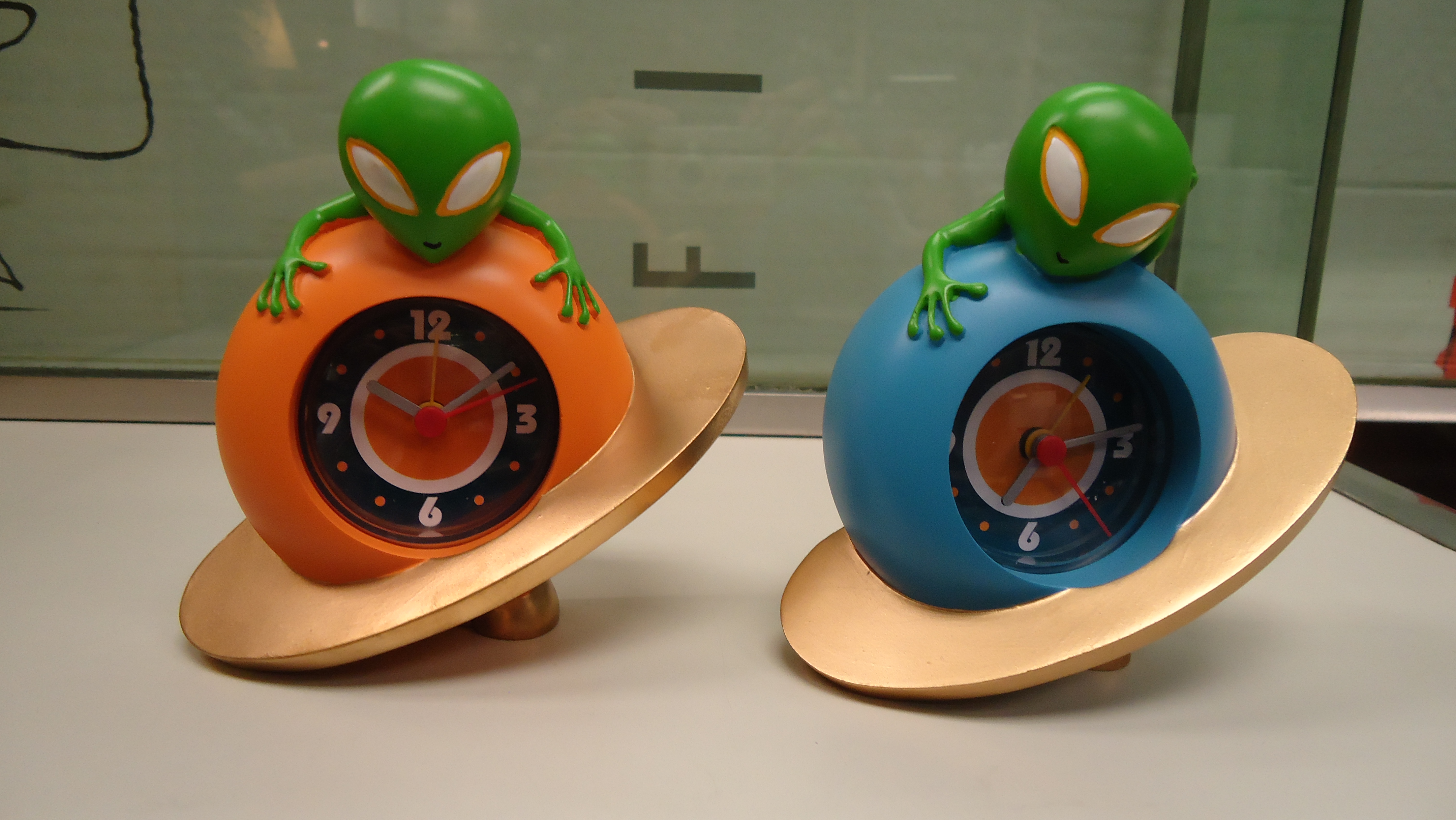 Divertido Reloj- Despertador Marciano ©diseño exclusivo FISURA®, disponible en dos colores naranja y azul, fabricado en resina, funciona a pilas. Medidas 12 al x 13 lar x 4 ancho. PARA COMPRA DE CANTIDAD CONSULTAR PRECIO.